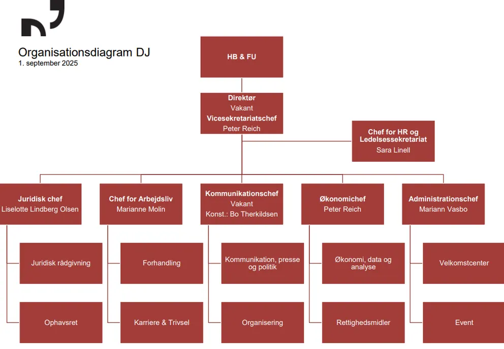 DJ ledes af et forpersonskab bestående af forperson og næstforperson, valgt direkte af delegeretmødet.